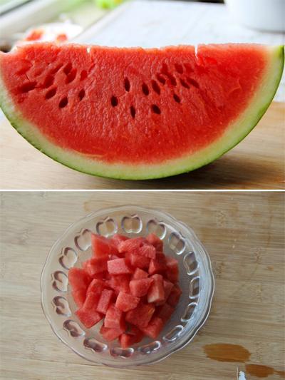 ![]() | Bước 3: - Với dưa hấu, bạn cũng cắt bỏ vỏ rồi cắt thành miếng hạt lựu luôn nhé! |