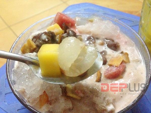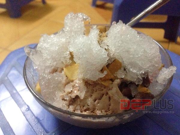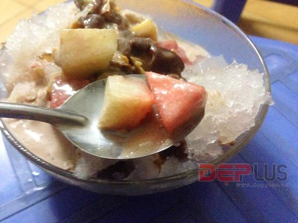 Món ăn thực tế không thể bắt mắt như trên phim ảnh nhưng rất đầy đặn và nhiều nguyên liệu hấp dẫn. Thấy rõ nhất là hoa quả, miệng viên kem lớn và đậu đỏ, phủ bên trên một lớp đá bào mịn màng và dừa khô. Món hoa quả dầm tất nhiên phải trộn đều lên ăn mới ngon. Sau khi trộn, viên kem tan ra, hòa lẫn với đá bào, hoa quả, đậu đỏ tạo màu nâu hồng rất hấp dẫn. Hương vị món ăn không hề đơn giản như quán xá, đó là sự kết hợp hài hòa giữa vị ngọt đậm của kem, ngọt bùi của đậu đỏ, mát lạnh của đá bào, giòn tan của dừa khô cùng vị thanh chua độc đáo của các loại trái cây. Tất cả trung hòa tạo nên vị ngọt thơm vừa phải và mát rượi, xua tan hoàn toàn cái nóng nực mùa hè. Quả thật, không thể đánh giá món ăn khi chưa nếm thử chúng.