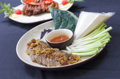 Vịt Chăn Thả Cuốn Lá Lốt: Lá lốt, hành tươi, vịt om giềng mẻ tất cả được cuốn trong lá bánh đa nhỏ, kết hợp tuyệt vời cùng nước chấm chua cay mặn ngọt được chế biến đặc biệt từ tỏi, hành, mẻ và sa tế.