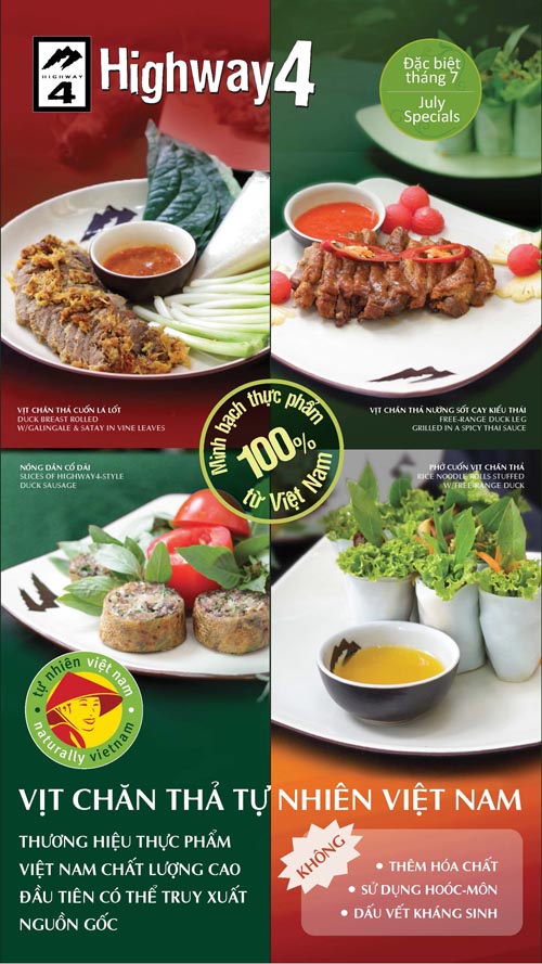 Là Thương hiệu Top 500 nhà hàng tốt nhất Châu Á, Highway4 luôn có tầm nhìn về một chất lượng cuộc sống tốt với những sản phẩm được chế biến bằng lương tâm và tiêu chuẩn cao. Highway4 chỉ sử dụng thịt gà và thịt vịt chăn thả Tự nhiên Việt Nam. Đây là thương hiệu thực phẩm Việt Nam chất lượng cao đầu tiên có thể truy xuất nguồn gốc. Với nguồn thực phẩm minh bạch, Tự Nhiên Việt Nam mang tới người tiêu dùng sản phẩm gia cầm “3 không”: Không hoóc-môn, Không hóa chất, Không dấu vết kháng sinh.