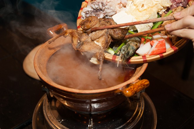 Kích thước nồi lẩu lại có hạn nên để thưởng thức loại lẩu này, bạn chỉ còn cách cho mỗi thứ một ít. Cái lợi của phương án này là không chỉ giúp bạn “bơi” trong rau đến no mới được thưởng thức thịt (vì bị chìm bên dưới) mà còn giúp bạn cảm nhận rõ hơn các loại thịt. Như thịt gà ta dai chắc, hải sản tươi ngọt, lòng thập cẩm dai giòn. Đã miệng nhất phải kể đến chim cút được ướp đủ thời gian, chiên đủ lửa hay thịt ếch, săn chắc, đậm đà.