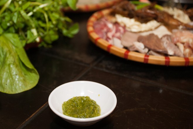 Phần “thịt thà” đã khác biệt, rổ rau xanh ăn kèm càng phong phú. Từ những loại rau quen thuộc của dòng nhúng dấm như cải thảo, cải thìa, nấm bào ngư, nấm kim châm, bông hẹ, bông bí, xà lách xong, tàu hủ ki, đến loại trái tưởng như không bao giờ có mặt: bắp non, bắp Mỹ.