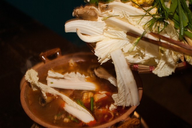 “Trong quá trình tìm công thức chuẩn cho món ăn này, khó nhất là nước lẩu. Hương và vị thế nào để nước lẩu không chỉ đảm bảo hương vị của các thành phần mà còn gắn kết chúng với nhau là một câu hỏi khó. Chúng tôi đã thử kết hợp nhiều loại nguyên liệu, gia vị khác nhau để cuối cùng cho ra nước lẩu có hương thơm thoảng vị cay nhẹ của ớt, của sả cùng vị chua thanh của giấm bổng, ngọt vừa của xương, cùng một số gia vị được nêm nếm theo tỷ lệ riêng”, anh Lâm chủ quán chia sẻ.