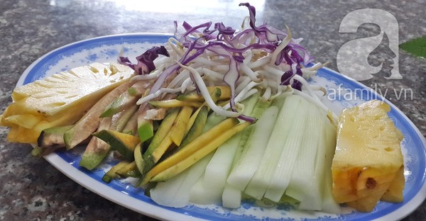 và cả các loại củ quả thái mỏng: dứa, chuối xanh, dưa chuột, xoài xanh, giá đỗ, bắp cải tím…
