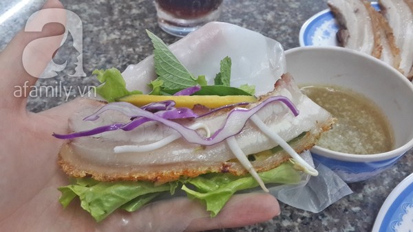 Thưởng thức bánh tráng cuốn thịt heo quay phố Nguyễn Ngọc Vũ