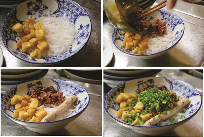 Nếu để ý bạn sẽ thấy các nguyên liệu luôn được chuẩn bị đầy đủ. Chỉ cần khi thực khách gọi, bún sẽ được cho vào nồi nước sôi chần nóng, đổ ra bát, thêm ít thịt bò chần chín (hoặc tái theo yêu cầu của khách), gạch cua, đậu phụ rán miếng nhỏ, một giò tai, nhúm hành lá rồi nước dùng nóng sẽ được rưới lên.