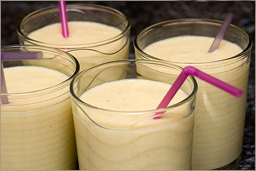 Xoài gọt vỏ, bỏ hạt, xắt miếng, chuối bóc vỏ, xắt miếng nhỏ. Cho tất cả các thành phần vào xay nhuyễn, cho ra cốc khuấy đều là dùng được.