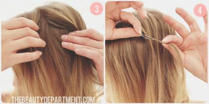 Bước 5: Bắt ngang bím tóc sang phần mái bên kia và gài đuôi tóc cố định bằng chiếc chun nhựa đã buộc sẵn. Để cố định chắc chắn hơn, bạn có thể gài thêm ghim sắt!