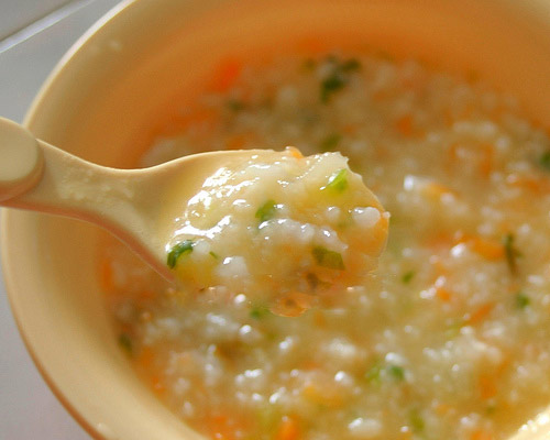 Ninh nhừ một nhúm đậu xanh và một vài hạt gạo để được bát cháo loãng, sau đó rắc tía tô thái nhỏ sẽ giúp bé giải cảm nhanh hơn.