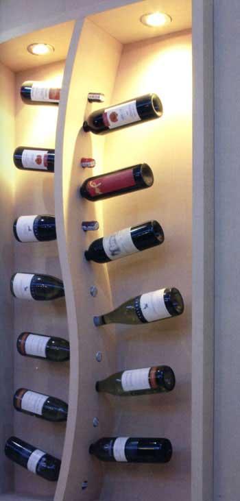 Với những căn nhà phố thường có diện tích nhỏ hẹp, việc bố trí kệ rượu cần có sự cân nhắc để không chiếm quá nhiều diện tích. Kệ rượu nằm dọc hành lang là một ý tưởng độc đáo. Vật liệu chủ yếu bằng gỗ tự nhiên và kính được thiết kế thành các hộp song song nhau, kết hợp với đèn chiếu điểm biến kệ rượu này trở nên rất thu hút.