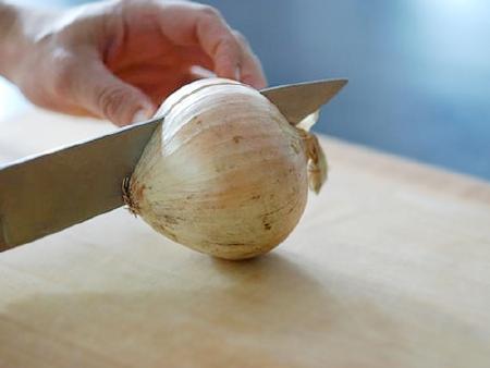 1. Một con dao thật sắc: Một con dao sắc sẽ giúp nhát cắt của bạn thật êm ái và hạn chế các chất gây khó chịu cho mắt có trong củ hành bắn ra ngoài.