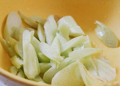 - Dọc mùng dùng dao tước bỏ phần xơ phía bên ngoài, rửa sạch, thái vát. Trộn vào dọc mùng một ít muối, để yên khoảng 15 phút, dùng tay bóp nhẹ, rửa lại cho thật sạch. Đun nồi nước sôi, chần sơ dọc mùng qua nước sôi, vớt ra để vào đĩa.