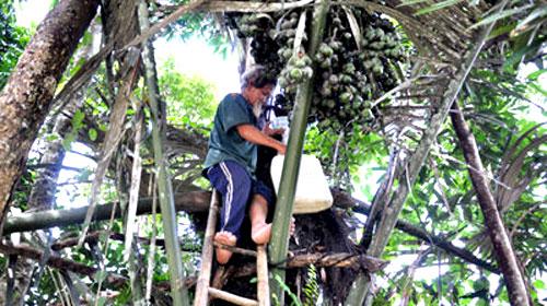 Già Gọi “phóng” lên cây lấy can rượu tà vạt xuống đãi khách - Ảnh: T.Vũ